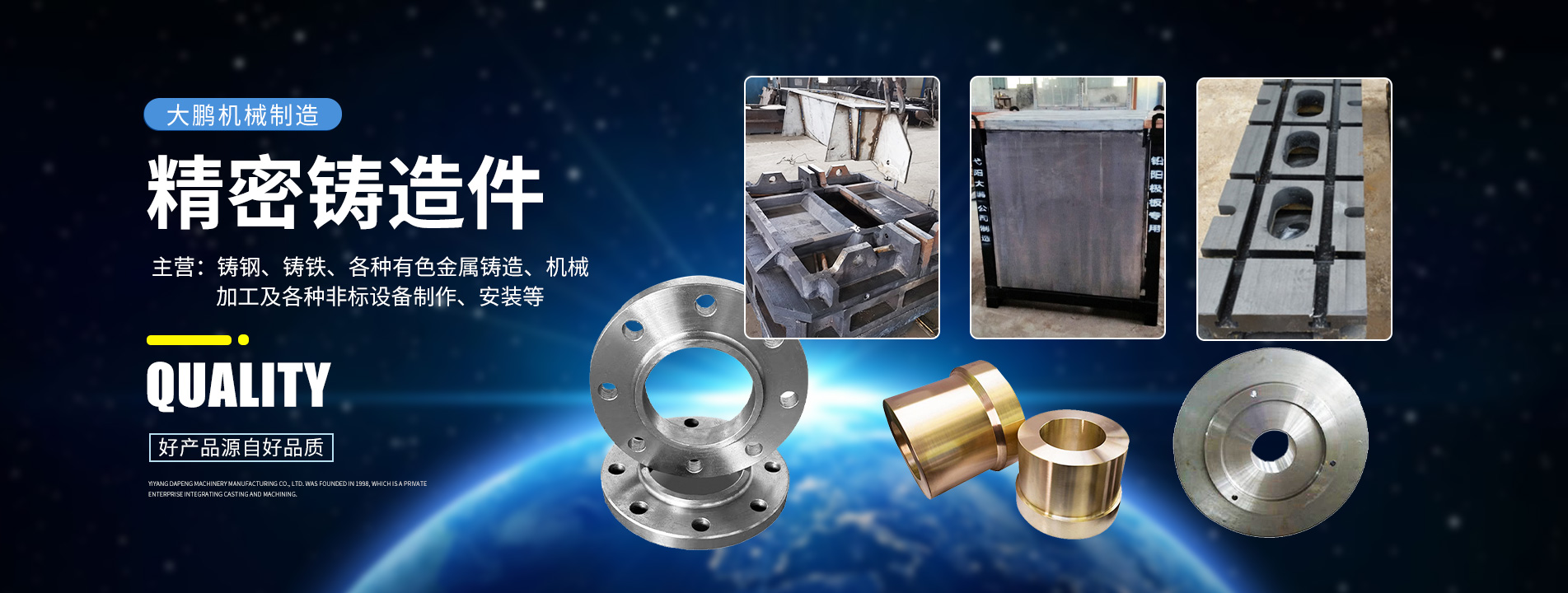 弋陽大鵬機(jī)械制造有限責(zé)任公司創(chuàng)建于1998年,是以專業(yè)鑄造和機(jī)械加工為一體的民營(yíng)企業(yè)。公司占地面積28000平方米,廠房、辦公等建筑面積8000m2。如今現(xiàn)有員工70余人,專業(yè)技術(shù)人員20余人,公司下設(shè)有材料剪切壓塊車間、鑄造車間、精鑄車間、金加工車間、熱處理車間、理化室等。