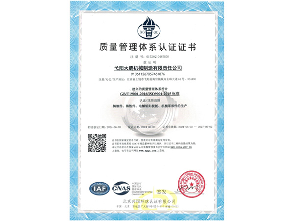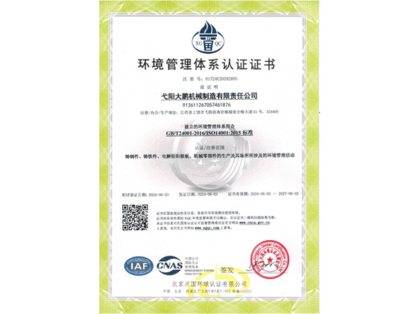 公司順利通過質(zhì)量管理體系認(rèn)證、環(huán)境體系認(rèn)證、職業(yè)健康安全管理體系認(rèn)證、環(huán)評(píng)。2015年5月獲國(guó)家工信委頒發(fā)的《鑄造企業(yè)準(zhǔn)入條件》;2019年做了安全現(xiàn)狀評(píng)價(jià);2020年取得了排污許可證。